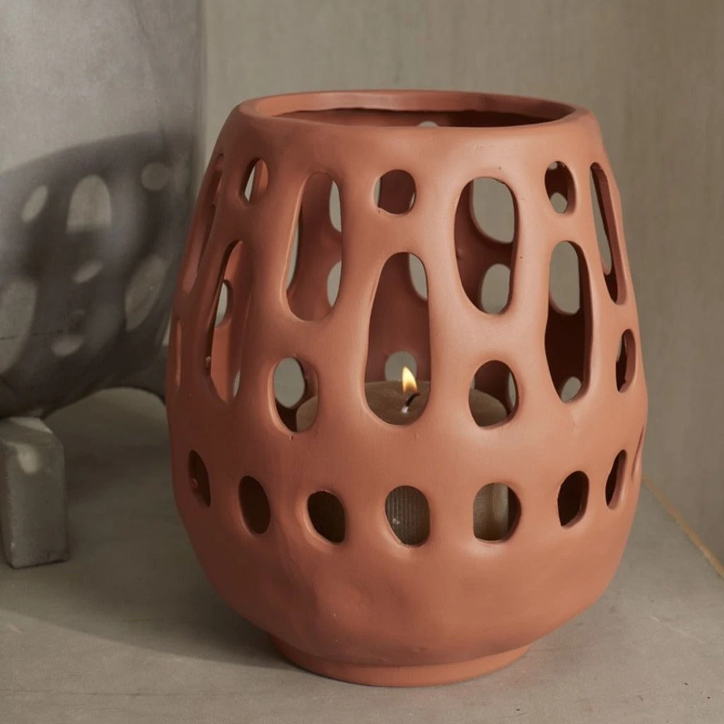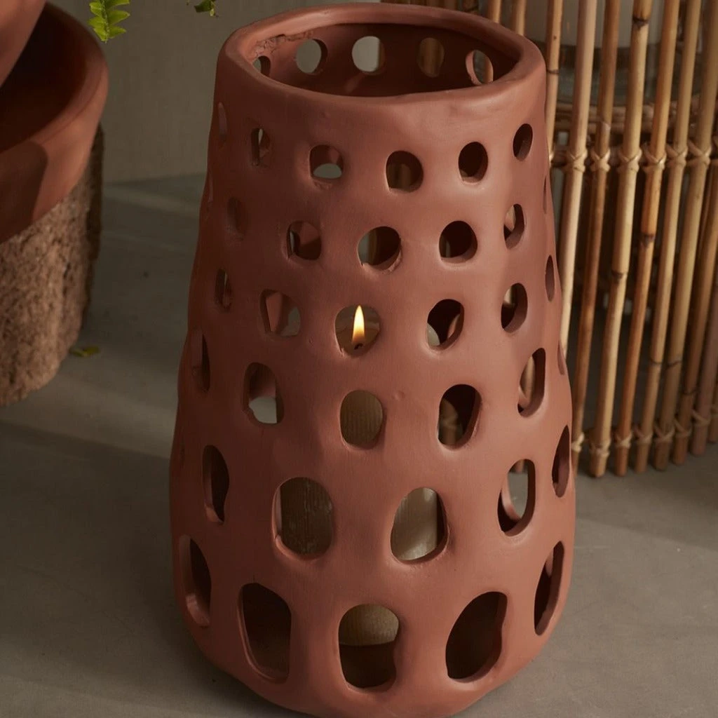 Create a dreamy outdoor space with the lightweight terracotta Alameda Lantern, featuring organic handmade cutouts. Place a citronella or pillar candle inside to ward off bugs & set the mood. Layer multiple sizes together for a cozy, dimensional glow.