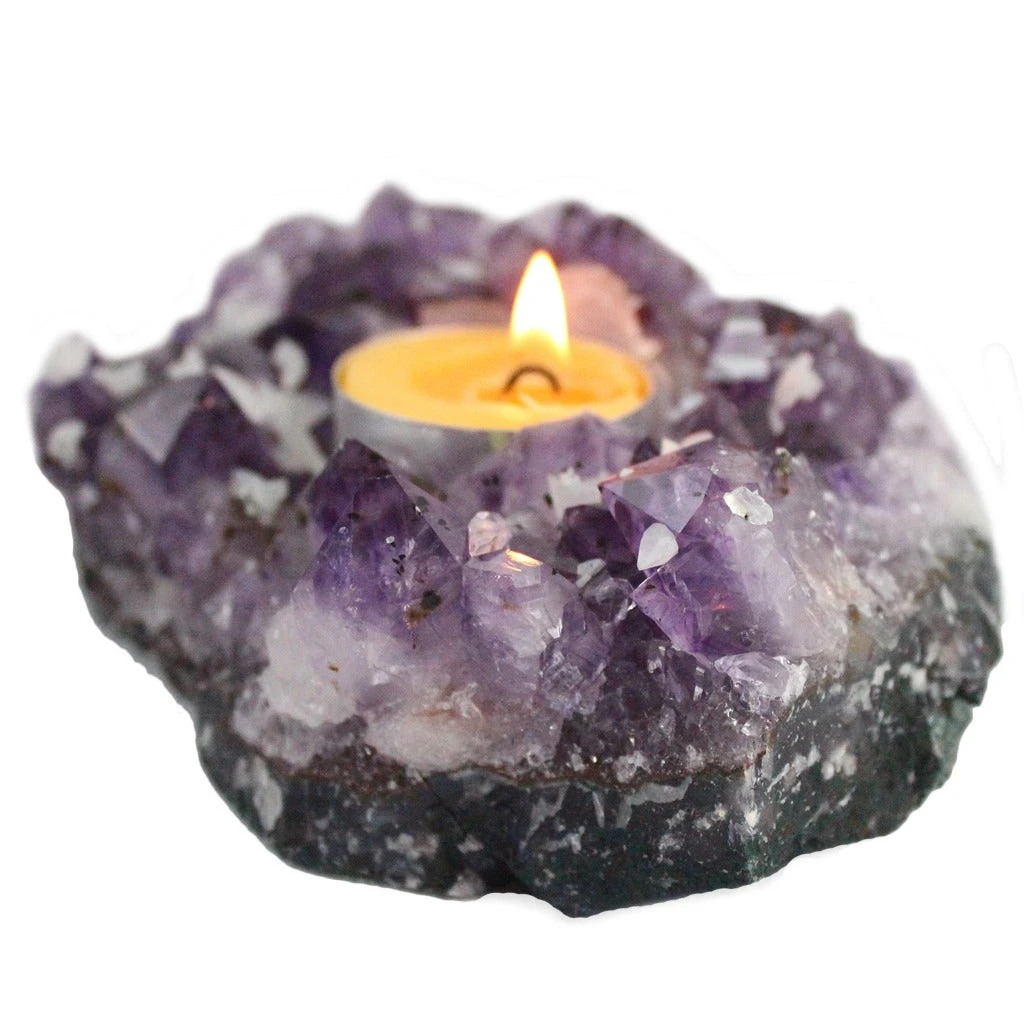 Add a gemstone to your home decor with this all natural, handmade and one of a kind amethyst tea light candle holder. As the tea light candle burns within the holder, the purple gemstone will glow beautifully. This piece is perfect as an accent piece on any shelf or table.Â
