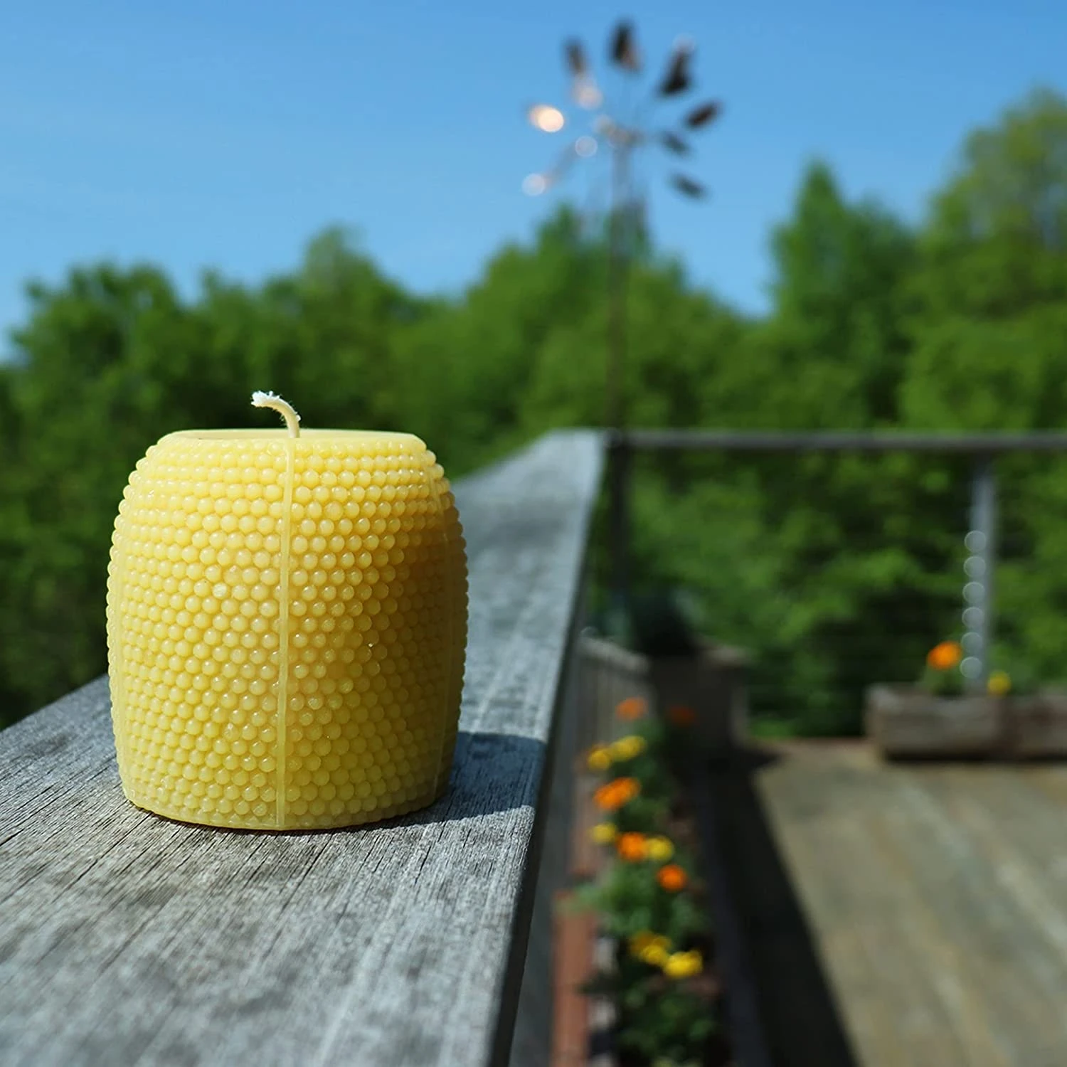 Enjoy the pure and clean burn of all natural beeswax with this textured hobnail pillar candle. This candle will burn long, clean, pure and bright. Add it to any table decor and delight in the warmth and light it brings.