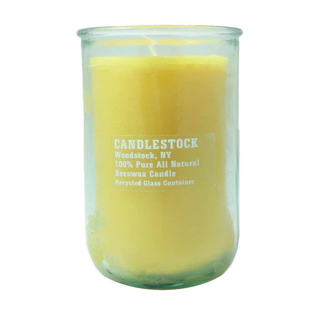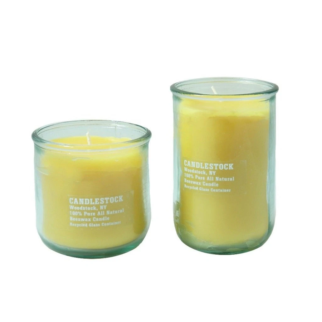 Enjoy our all natural, pure beeswax candle now in a recycled glass jar. Burn this clean burning and long lasting beeswax candle worry free since it is contained within a recycled glass jar.Â