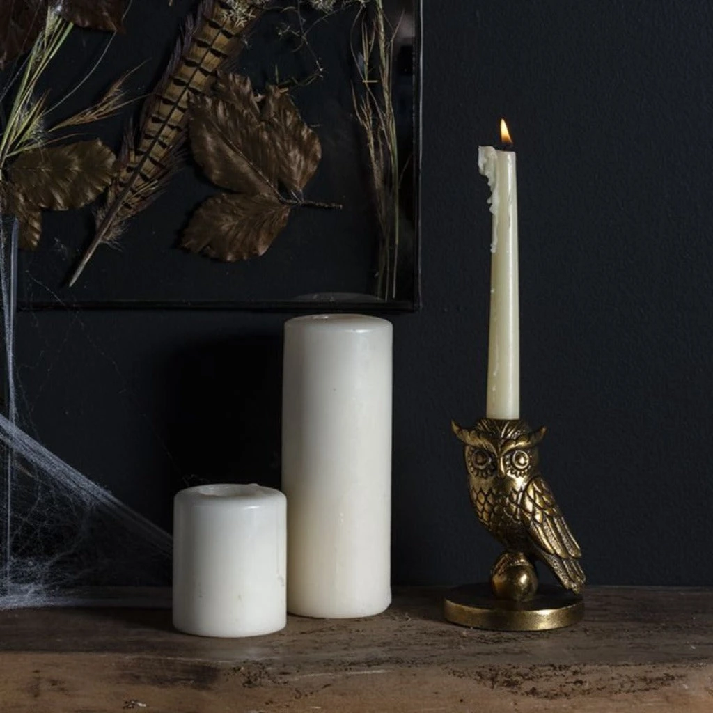 This adorable cast aluminum taper candle holder with a perched owl that rests on top of a flat circular base is a perfect piece for any home.