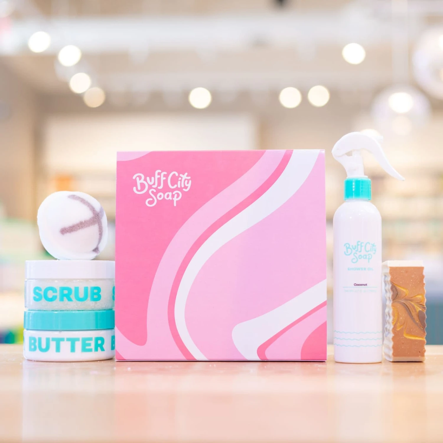 Coconut 5 Piece Gift Set So fresh it’s like cracking open a coconut on the beach. Refreshingly tropical and impossibly creamy, our coconut scent will have you dreaming of Pina Coladas and perfect summer sunsets. Our 5 Piece Gift Set includes 1 Ultra Moisturizing Soap Bar, 1 Bath Bomb, 1 Body Butter, 1 Body Scrub, & 1 Shower Oil.