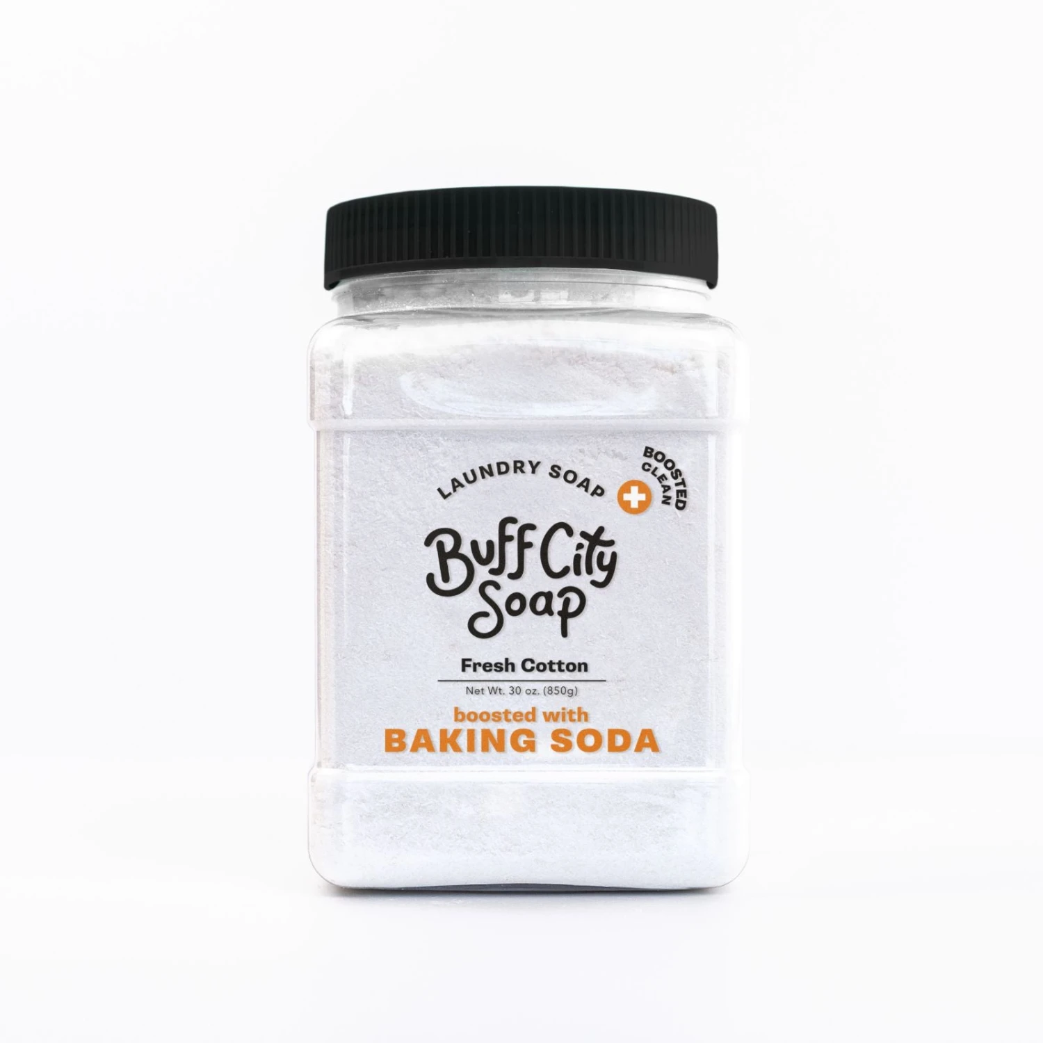 Fresh Cotton Laundry Soap Plus Plus up your laundry routine with Laundry Soap+! Each batch is handmade with 5 simple ingredients + baking soda for boosted cleaning power.