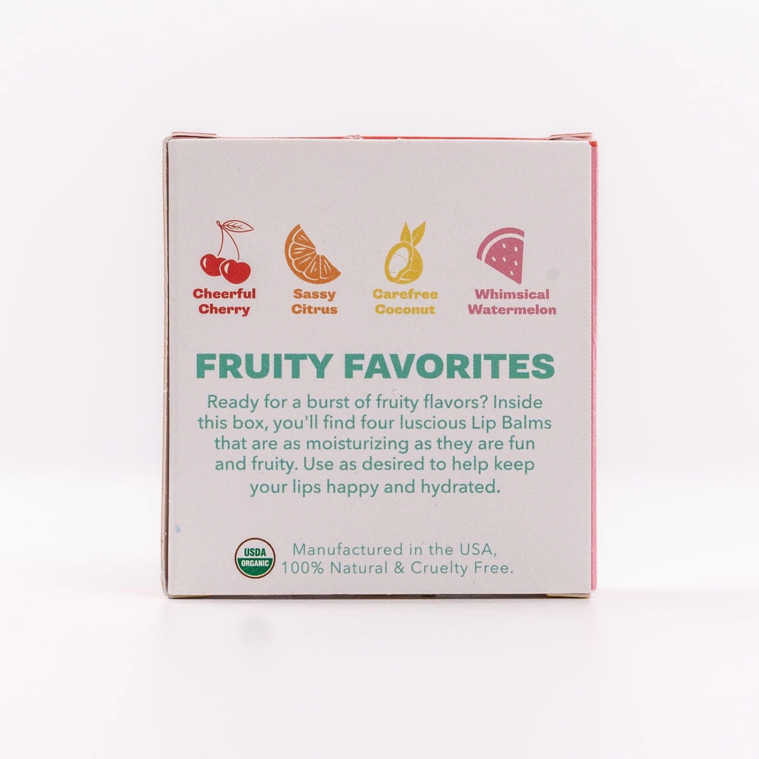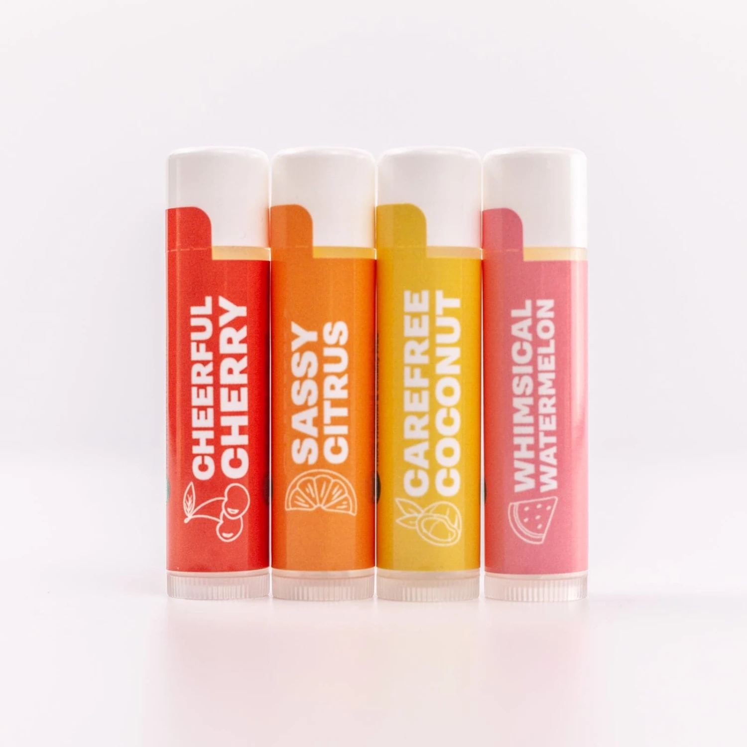 Fruity Favorites Lip Balm Set of 4 Discover an array of 100% natural and certified organic Lip Balms with a fruity twist. Made with organic sunflower oil, organic beeswax, and organic coconut oil, Buff’s Lip Balms will keep your lips happy and hydrated. Enjoy our smooth, silky lip balm in these four delightful fruit scents: Cheerful Cherry, Sassy Citrus, Carefree Coconut, and Whimsical Watermelon.