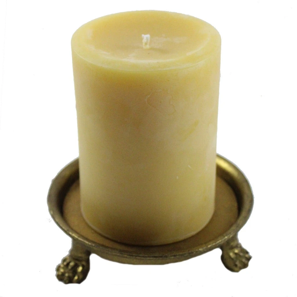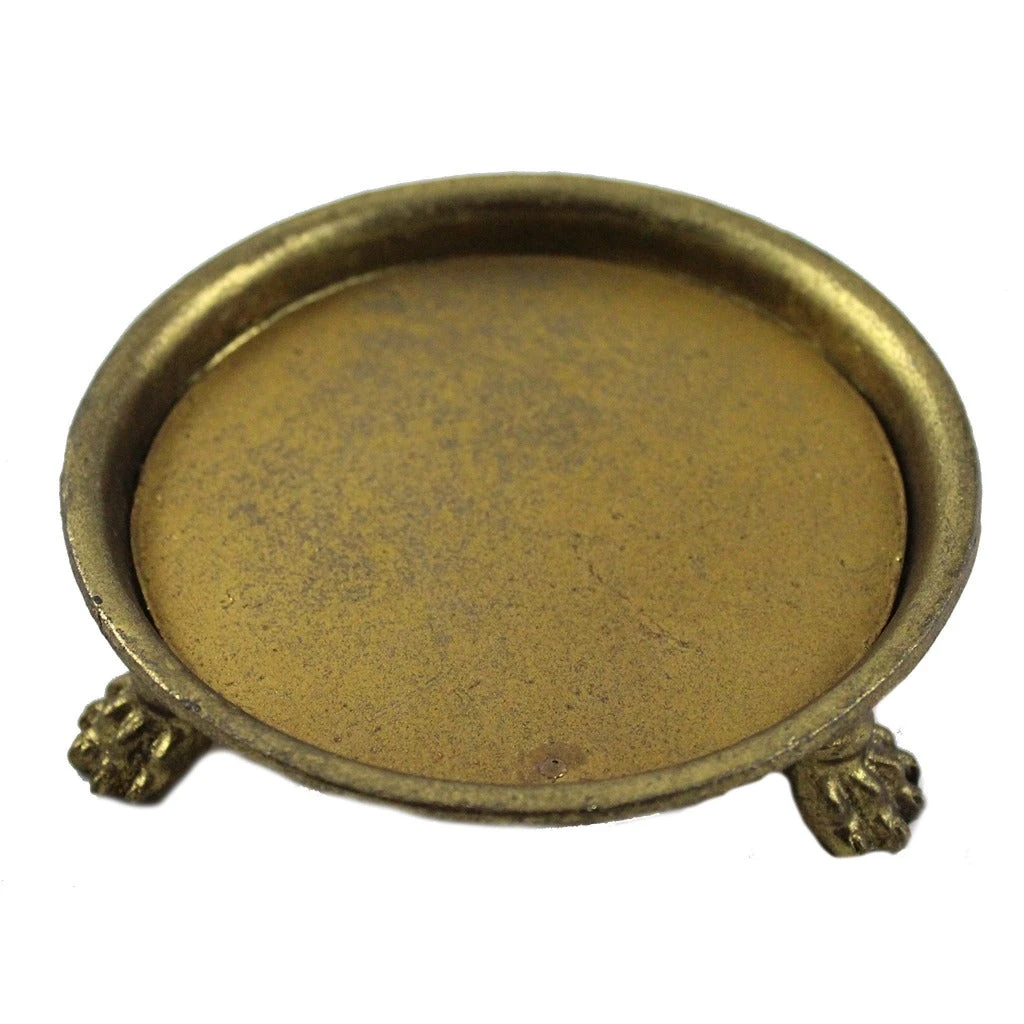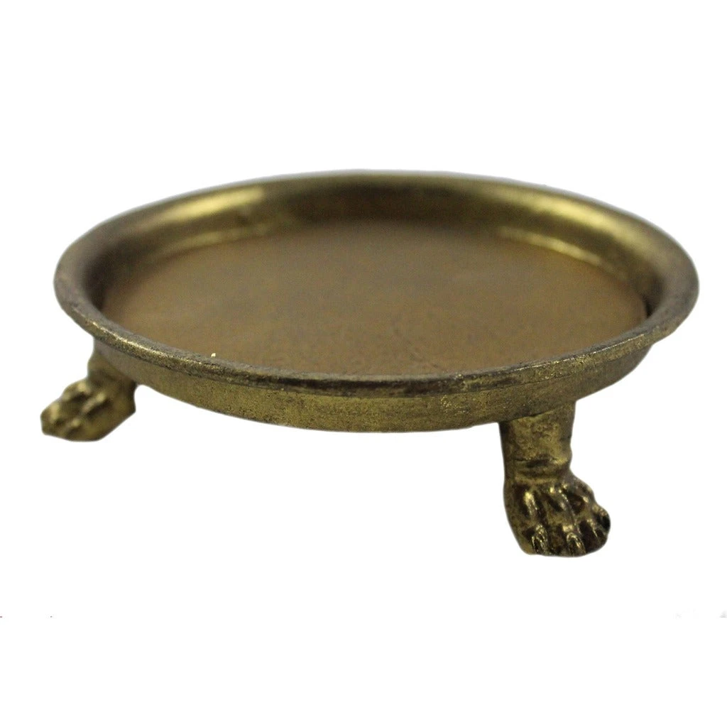 This candle tray has a round dish that sits atop four clawed animal feet. This unique home decor piece is perfect for tea light candles, votive candles, pillar candles no larger than 4 inches in diameter or any other small house hold item. This candle tray is finished with a metallic gold leaf.Â