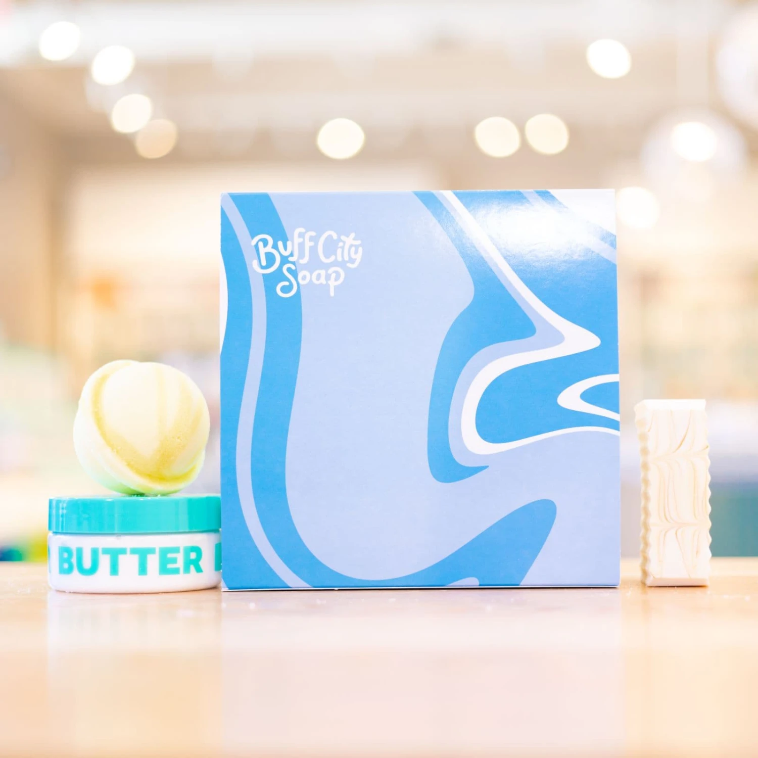 Good Morning Sunshine 3 Piece Gift Set Rise and shine with a cheerful splash of champagne and citrus fruits. This fresh, fizzy concoction awakens the senses and puts sunshine in your step! Our 3 Piece Gift Set includes 1 Ultra Moisturizing Soap Bar, 1 Bath Bomb, & 1 Body Butter.