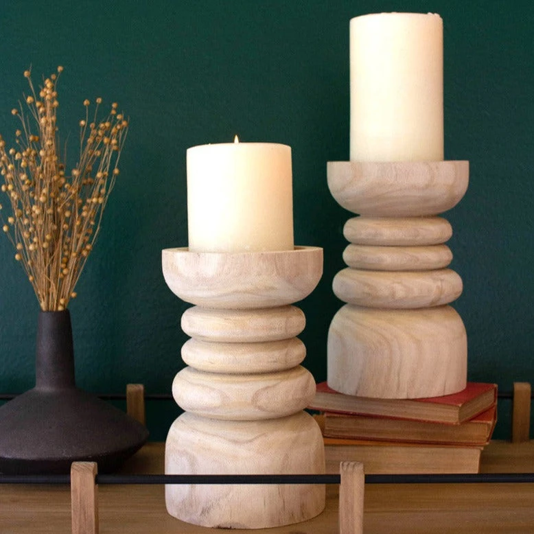 Elevate your décor with this Lou Wood Pillar Candle Holder! Handcrafted using delicate wood and a unique design, it brings a touch of rustic charm to any home. Make your space breathe with this inviting and captivating candle holder!Â