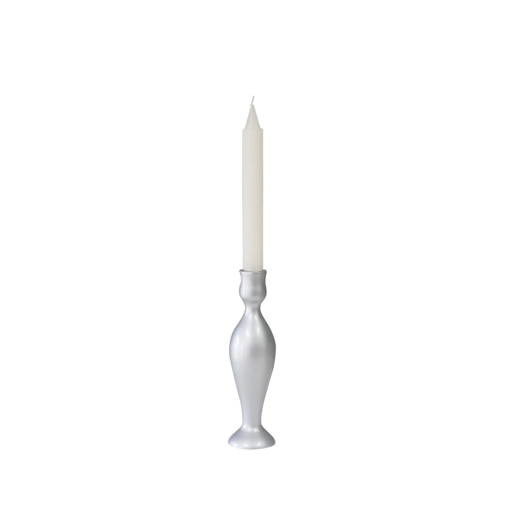 Beautiful wooden taper candle holder with a metallic silver paint.