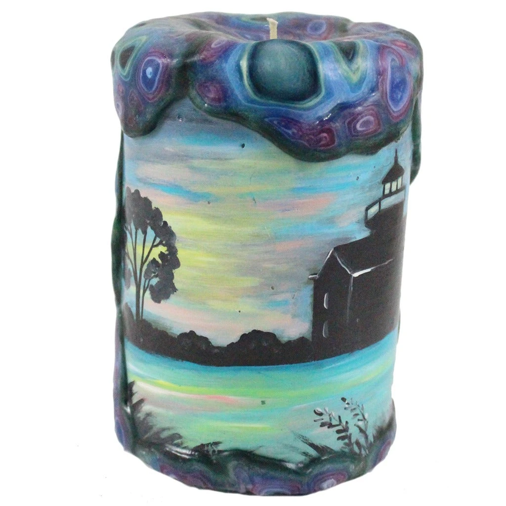 Bring a piece of locally made art work to your home decor with this handmade and hand painted pillar candle. This pillar candle is painted with a peaceful waterfront scene featuring a silhouette of a lighthouse and tree. As this candle burns down the outer design will remain and glow bright.Â