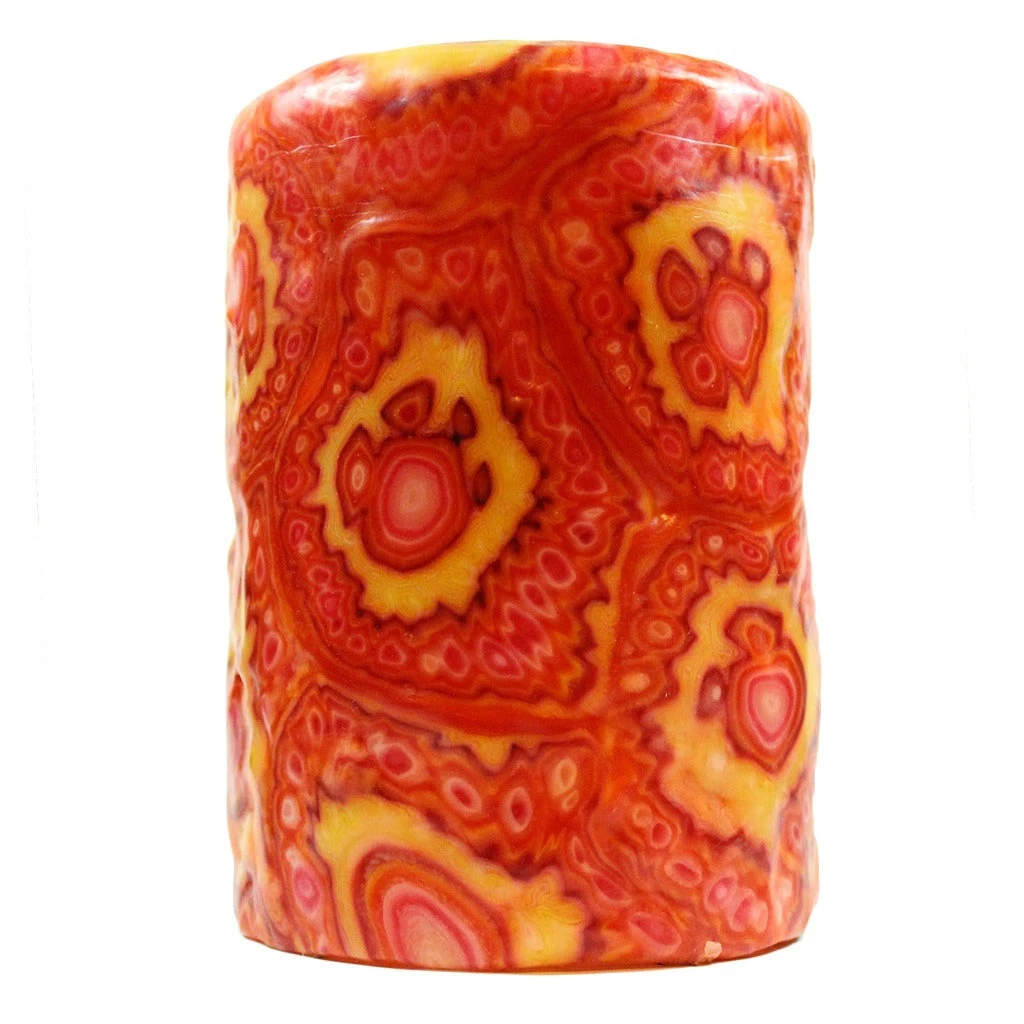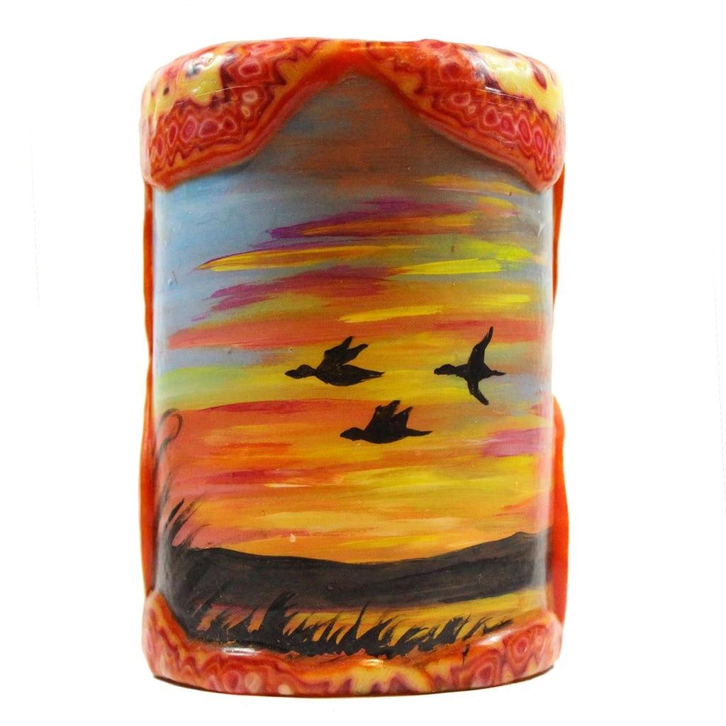 Brighten your home with this locally handmade and hand painted pillar candle wrapped in colorful veneer. This pillar candle is painted with a colorful sunset and flying geese    silhouette scene. As this pillar candle burns down, the outer design and veneer will remain and glow like stained glass. Add this candle to your home decor or give it as a beautiful long lasting gift.Â