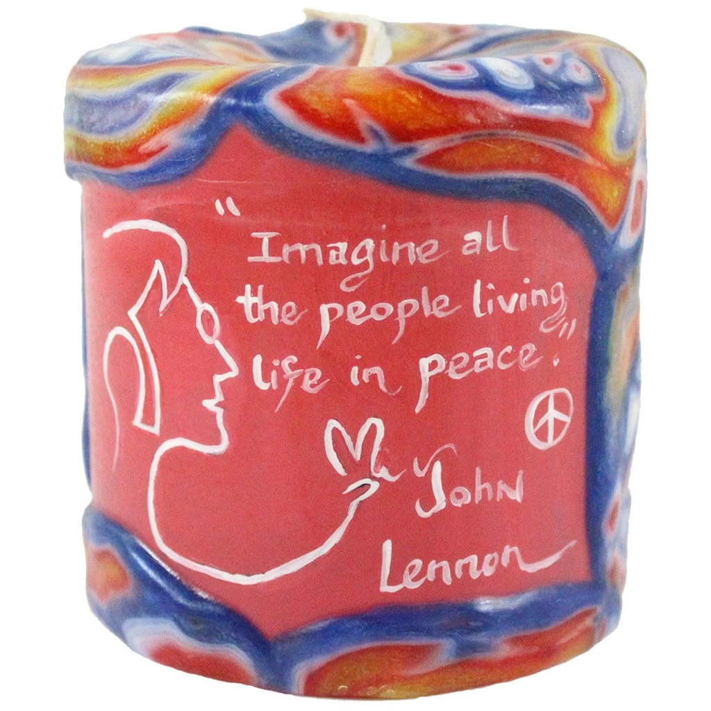 Bring a piece of locally made art work to your home decor with this handmade and hand painted veneer pillar candle. This pillar candle is painted with a bright red background and white script font that reds “Imagine all the people living in peace.” – John Lennon. A silhouette of Lennon is also painted delicately in white. As this candle burns down the veneer and outer design will remain and glow bright.Â