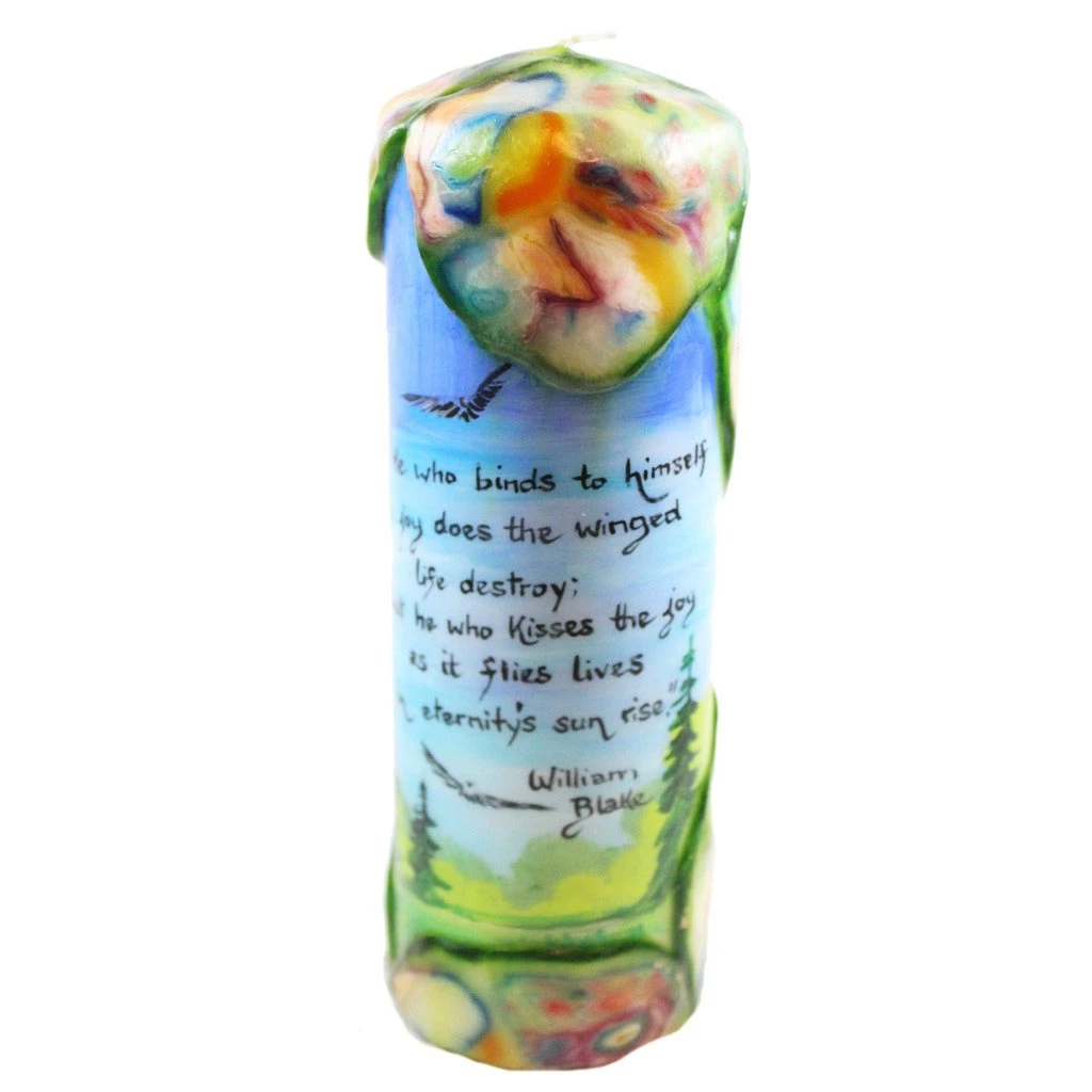This handmade and hand painted pillar quote candle is truly one of a kind and will burn long and bright in your home decor. Decorating this beautiful candle are the words of this famous poet William Blake. Add this quote pillar candle to your own home decor or give it as an inspirational gift.