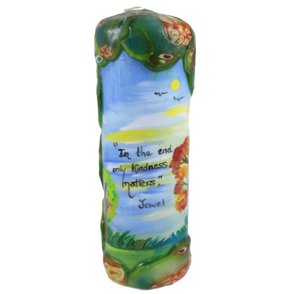 This handmade and hand painted pillar quote candle is truly one of a kind and will burn long and bright in your home decor. Decorating this beautiful candle are the words of a famous musician. Add this quote pillar candle to your own home decor or give it as an inspirational gift.