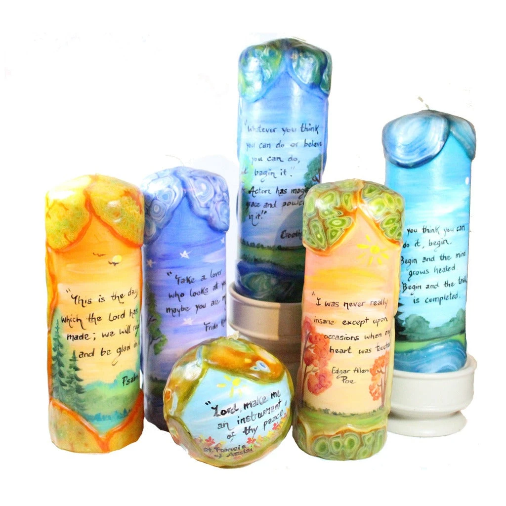 *Each of these beautiful pillar candles is hand painted. This creates wonderful variations in color and pattern from the candle you see here to the unique candle you receive.*