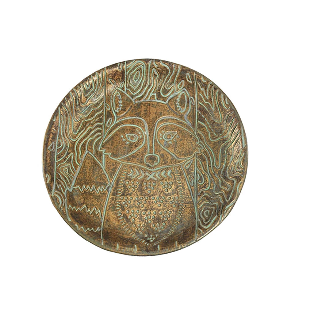 Set your pillar candles or tea lights on this metal tray depicting a raccoon in the forest. The design is hammered in and painted grey to pop against the metal.