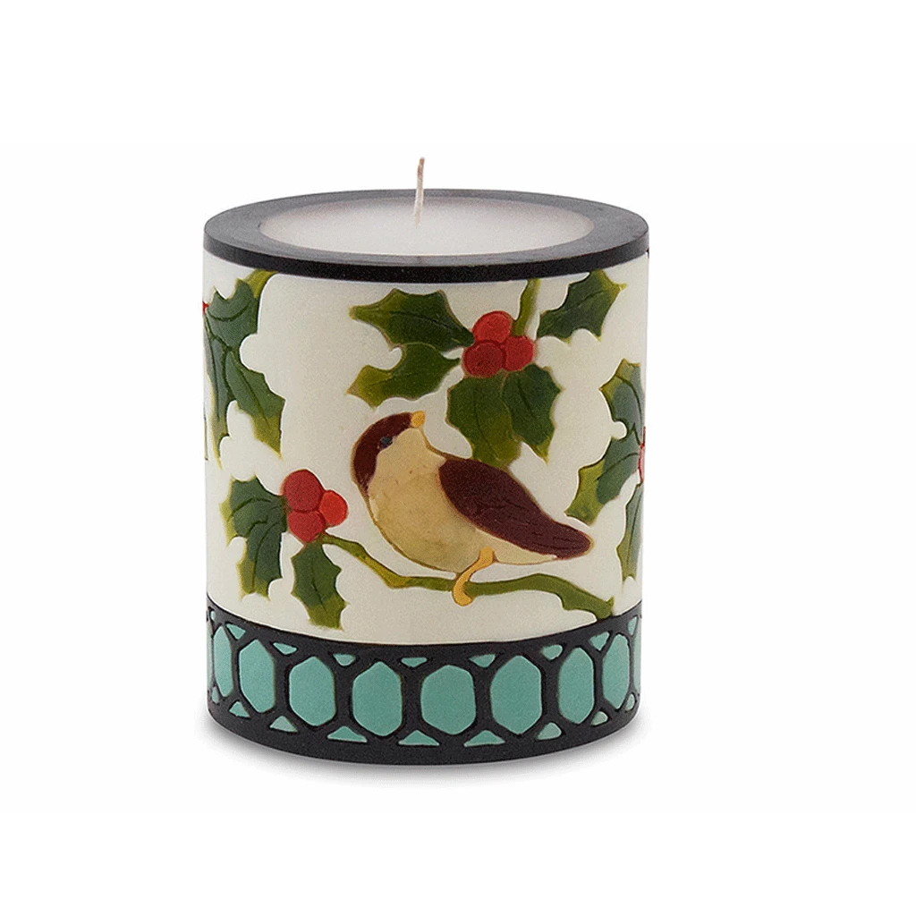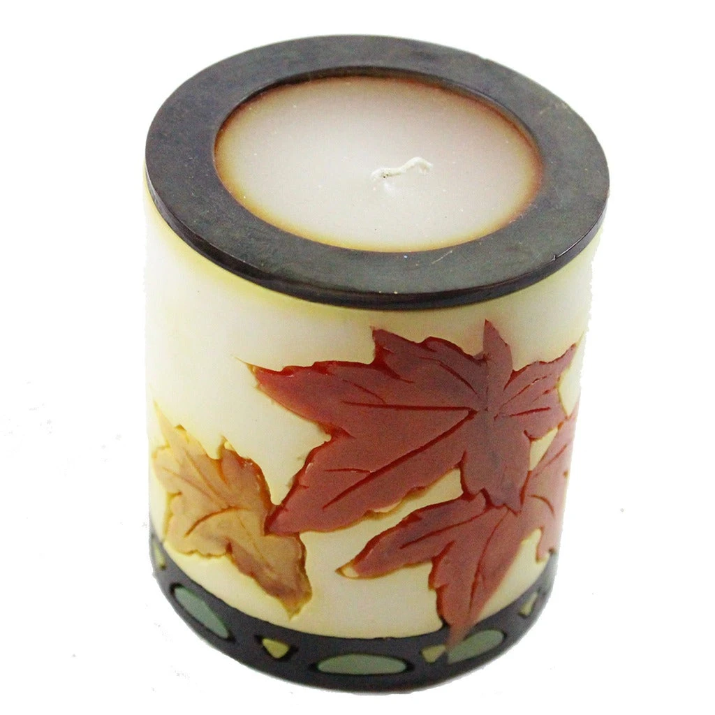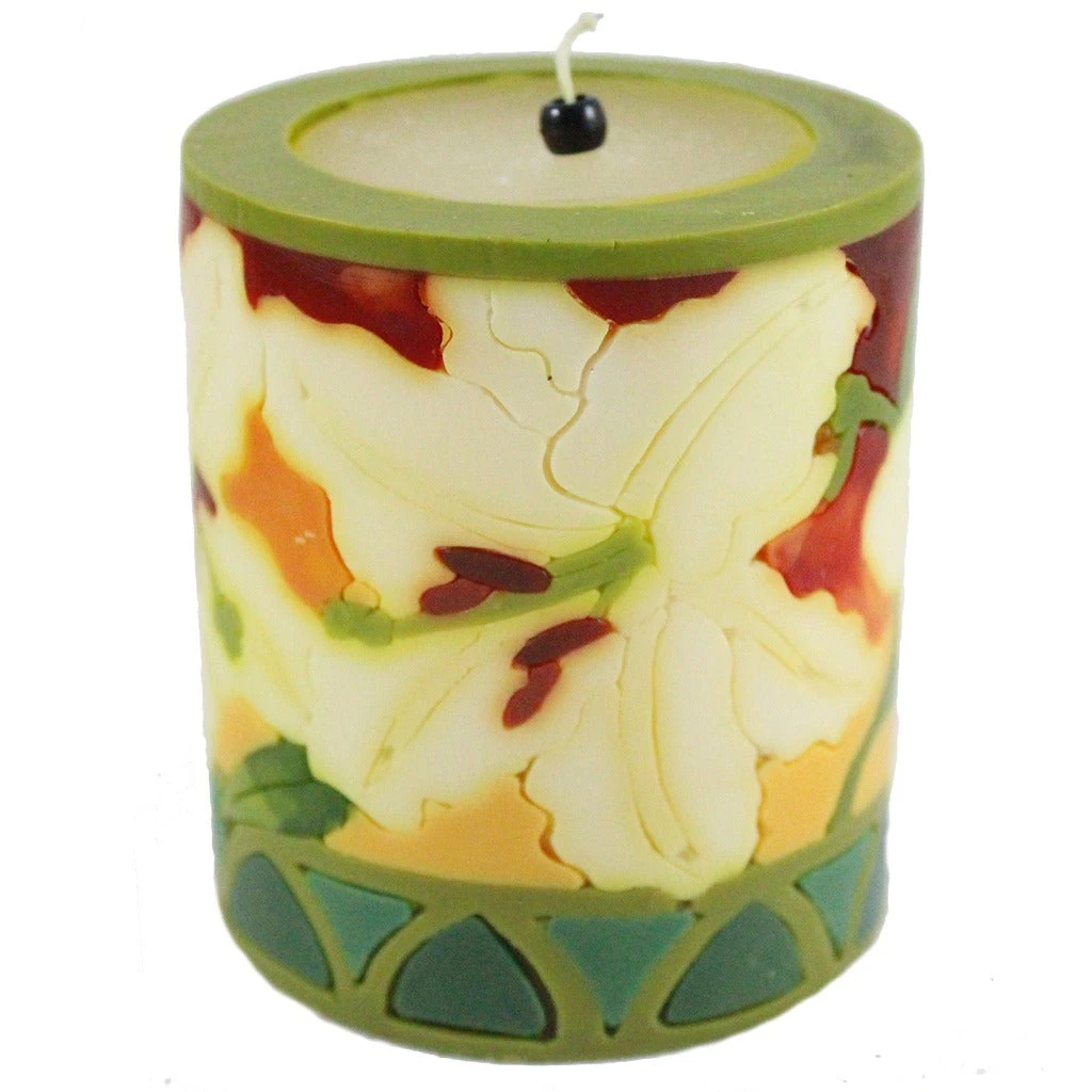 When burning your inlay pillar candle, burn the cream colored center wax until the wax pool is to the outer ring of wax which can appear dark green, light green or black. Do not burn past the outer ring, this will cause the design work to melt away. However, burning the candle for too short of a time will cause the well to be too shallow which will negatively effect the burn time of your pillar candle. After burning down the center column of cream colored wax, the outer design shell of wax can be refilled and the burning process can begin again!