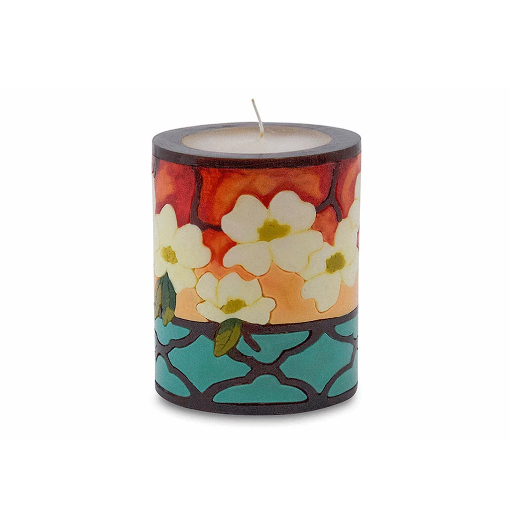 Each of these designed pillar candles is handcrafted in California. These pillar candles are made with unique inlay designs that will never burn away, they will glow as the center cream colored column of wax burns down.