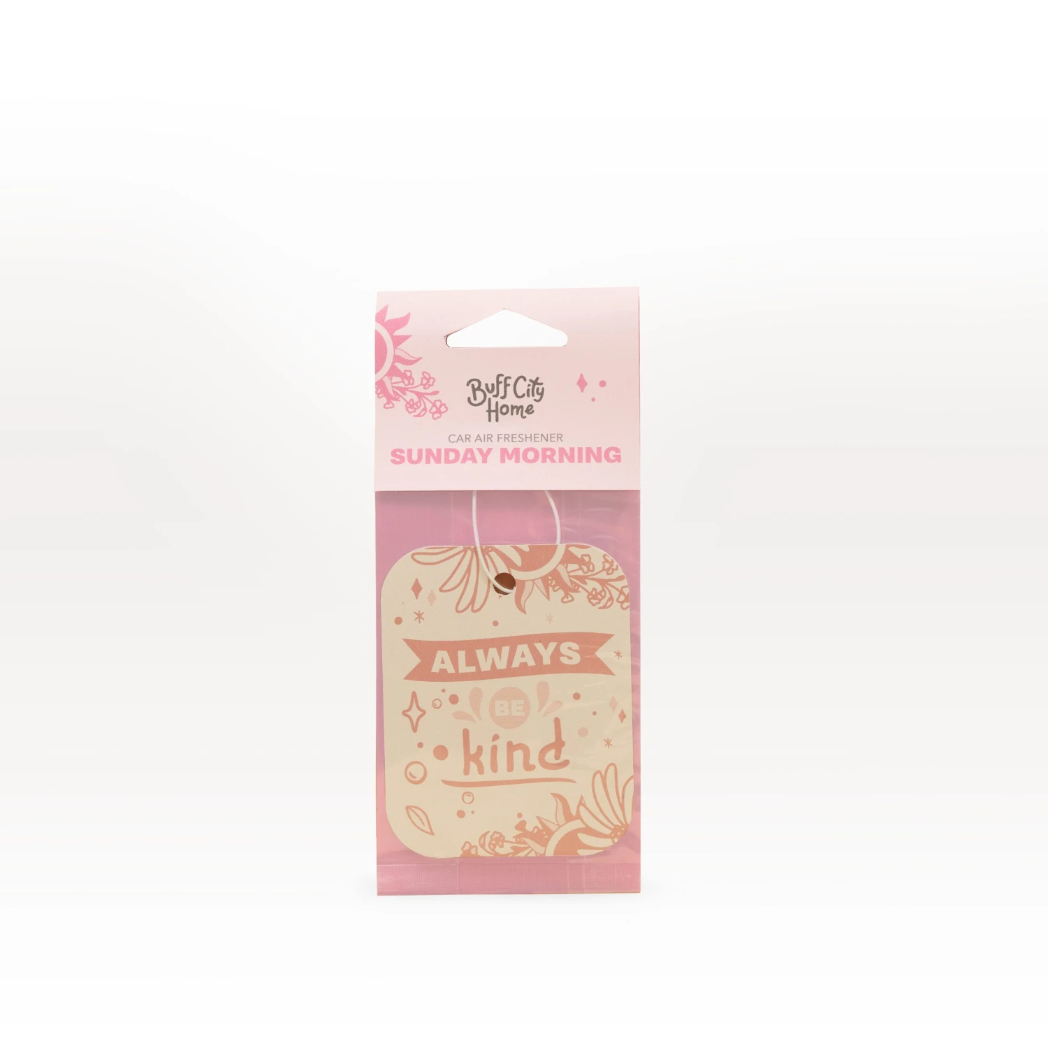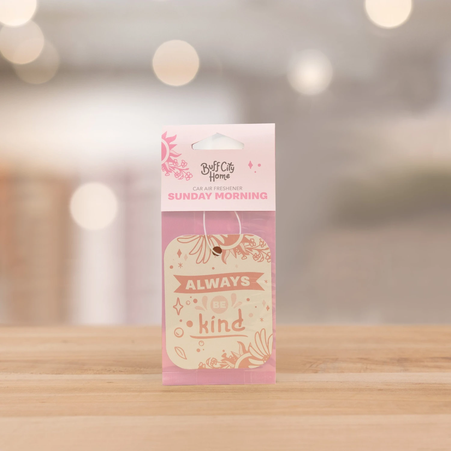 Sunday Morning Car Air Freshener A sweet companion for cruising around town. Notes of tangerine, rain showers, & geranium help brighten up your weekend drives.