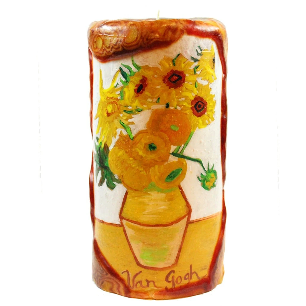 This handmade and hand painted Van Glow pillar candle is painted with Van Gogh’s famous ‘Sunflowers’ painting and wrapped in an amber veneer. As this unique pillar candle burns down, the outer veneer and design will remain and glow bright. Add this candle to your own home decor or give it as a beautiful gift.