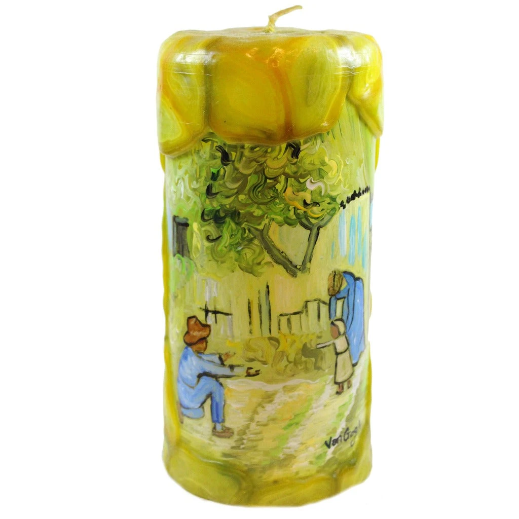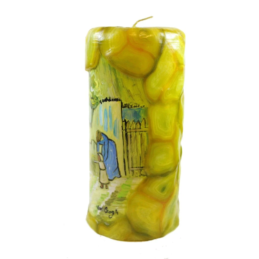 Bring Van Gogh’s artwork to your home decor with this handmade and hand painted veneer wrapped pillar candle. Painted at the center of this candle is a replica of Van Gogh’s “First Steps” masterpiece. As this candle burns down the outer veneer and design will remain and glow bright.