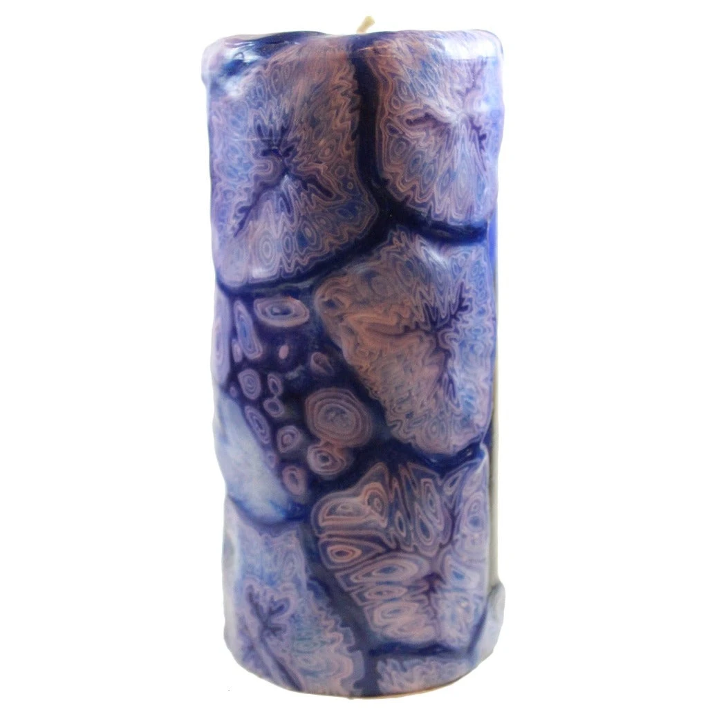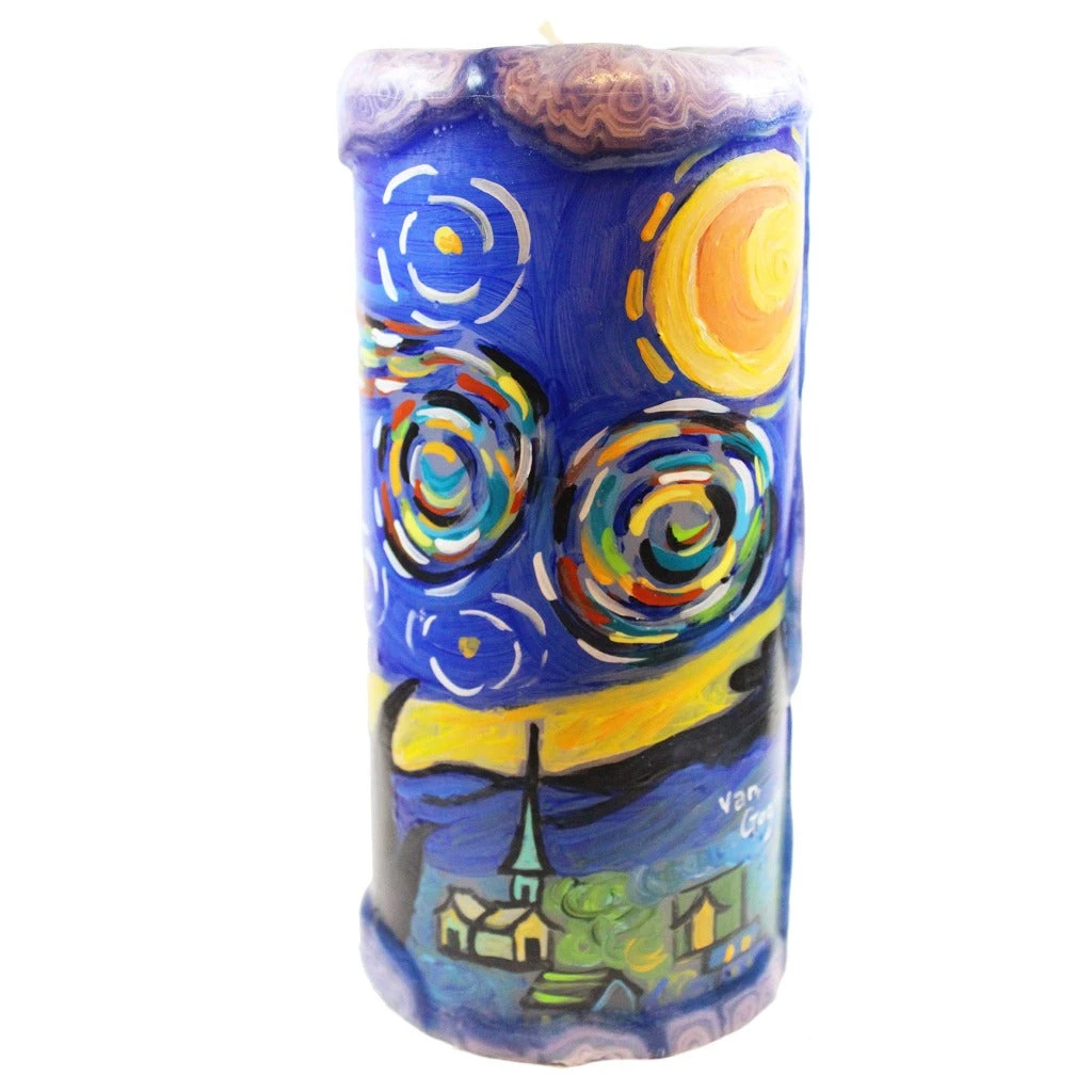 Bring home a Van Gogh masterpiece with this handmade and hand painted veneer wrapped Starry Night Van Glow pillar candle. This candle is lovingly hand painted by a local artisan. As this painted veneer pillar candle burns down the outer veneer and design will remain and glow bright.Â